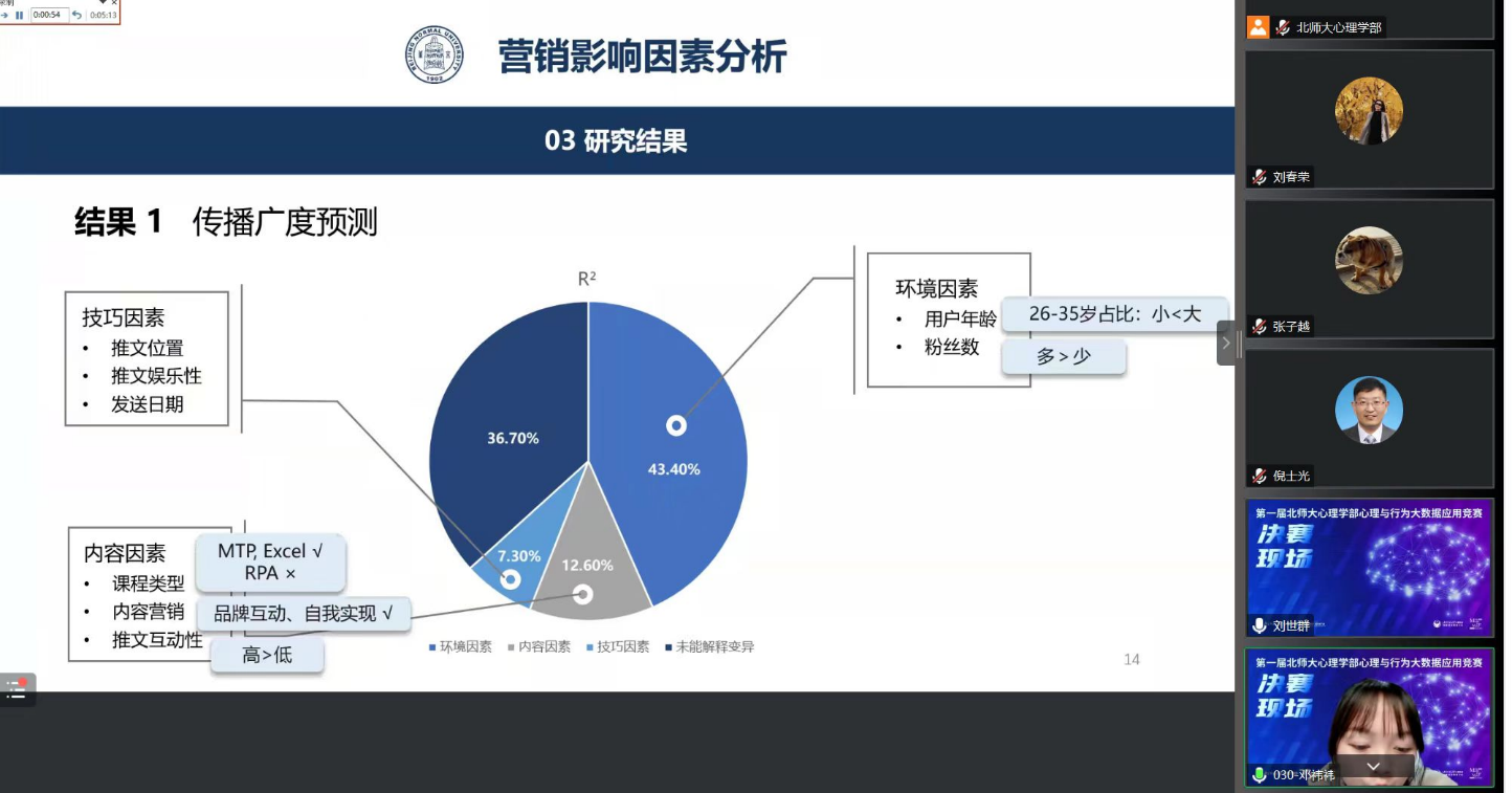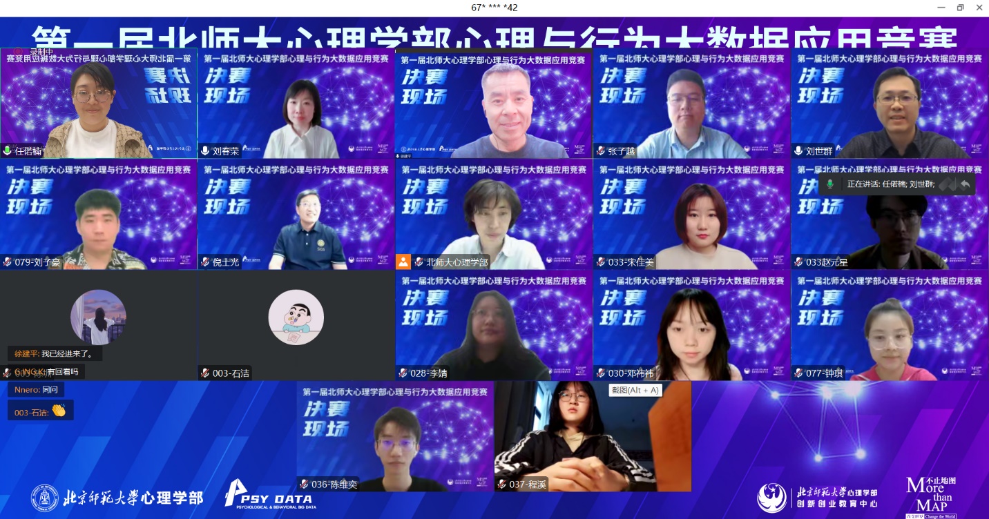 心理与行为大数据应用竞赛决赛以线上腾讯会议的方式举行。 此次竞赛旨在推动心理与行为大数据跨领域学科发展,将知识学习与社会需求相结合,培养学生解决实际问题的能力,并加强校企合作,大赛有包含来自清华大学、华南师范大学、广州大学、北师大污污漫画 和本校外院共40余支队伍报名参赛,参赛人数达二百余人。竞赛期间,竞赛组委会将不定期举办答疑会及学术分享活动,加强学生用大数据技术解决实际问题的能力,并帮助各队完善参赛项目内容。