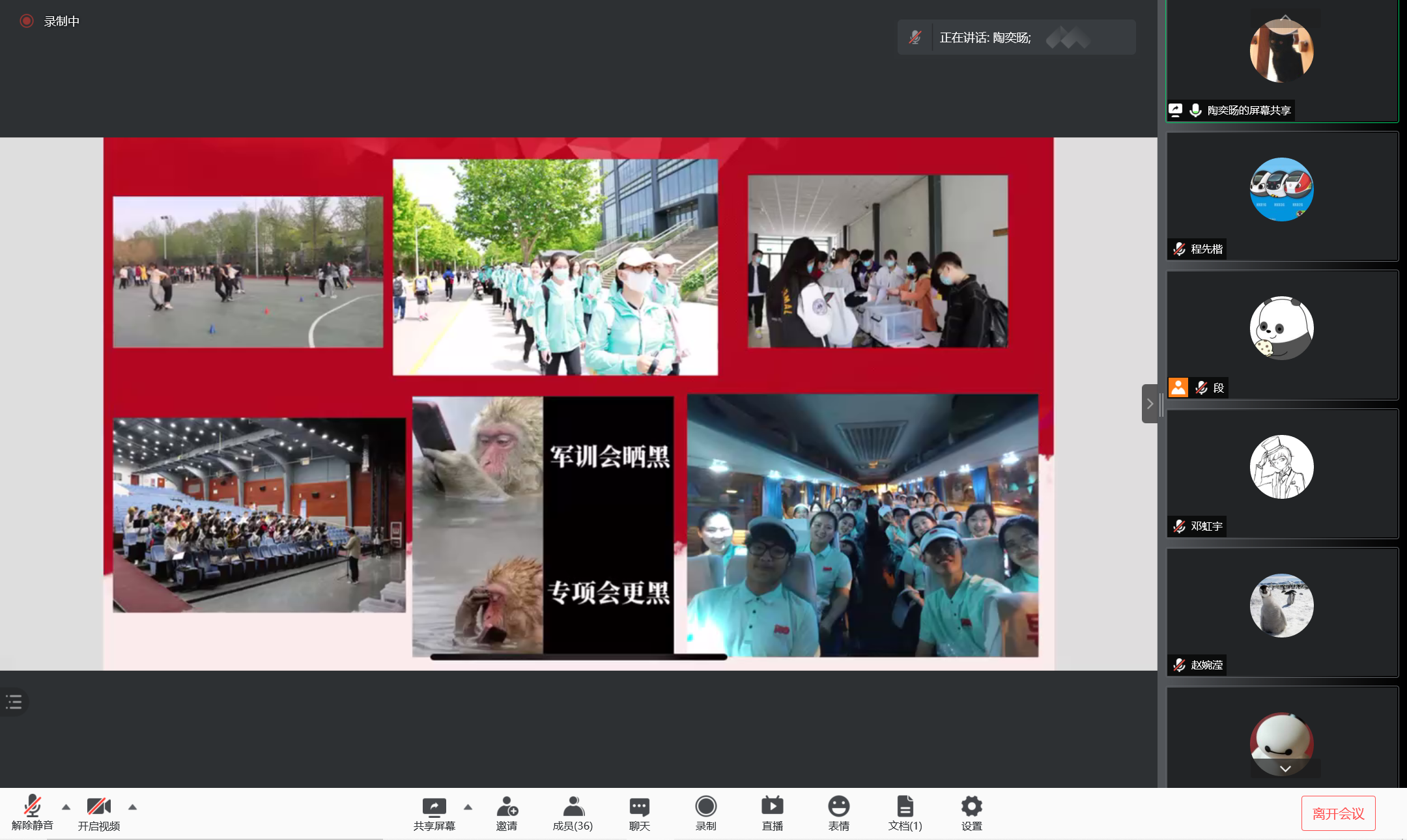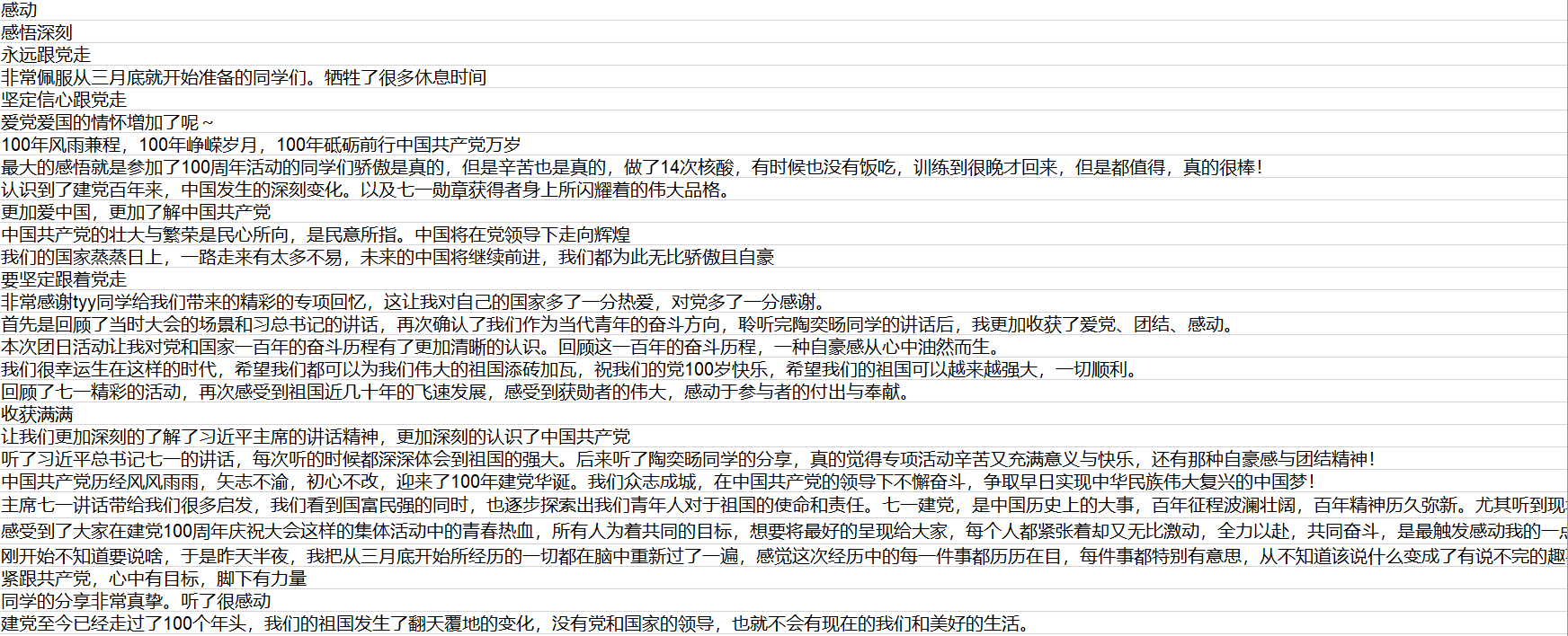 2021年8月1日19:00,污污漫画 2020级本科第二团支部“建党百年 强国有我”七一主题团日活动在线上顺利召开。会议由团支书段雨欣同学主持。 为庆祝中国共产党建党100周年,进一步增强共青团系统听党话、跟党走的使命意识,坚定党旗所指、团旗所向的政治方向,落实党有号召、团有行动的实践观念,根据上级团组织要求,我支部举行本次团日活动,会议由激情而富有青春活力的团歌开始,接着大家观看了“七一勋章”颁授仪式片段回放,七一勋章作为党内最高荣誉,获得者们就是各条战线上党员中的杰出代表,我支部团员们将以他们为榜样,建功立业,弄潮时代! 随后,大家观看了建党100周年庆祝大会回放节选,青年的表演朝气蓬勃,阳光向上;总书记的讲话声声有力,句句铿锵。天安门广场上不断地欢呼声也引起同学们的共鸣。我们生逢盛世,当不负盛世。 接着,我团支部参与庆祝大会合唱的同学和同学们分享了参与活动的体会和经历, 陶奕旸同学在会上进行分享,回忆了烈日下的次次训练,大家共同克服困难的坚定;回忆了每次训练结束后军乐团,各高校之间挥手致意的温暖,在训练过程中,大家已经形成了某种奇妙的连结,都在为了完成这项重要的使命而努力着。从开始只是很喜欢和大家一起唱歌,到感受到使命感,再到庆祝大会现场唱到“我们献身着壮丽的事业,无限幸福无限荣光”时发自内心的那种喜悦和自豪,有一种认同感,归属感,有一种热泪盈眶的感觉,唱出这些歌曲来为建党百年献礼时,美好的笑容是不需要刻意做出的。 涂康文潇同学以文字稿用三个关键词“温暖”,“严谨和劳累”及“自豪和感动”和同学们分享了感受,涂康文潇同学回忆了烈日下的次次合练,他们都认真对待,因为这代表着国家,代表着国家的青年,更一定要拿出最棒的面貌,为全国人民以及世界展示中国青年的风采!总书记的讲话多次被天安门广场的欢呼声打断。这是人民群众发自内心最真实的喜悦,没有经过排练,没有任何人要求,人民群众自发的,迸发出内心最激动的情感。是人民对祖国动听的情话! 最后,团员们填写问卷分享了自己的感想。大家都为总书记讲话中体现的百年来中华大地翻天覆地的变化而自豪,为参与专项活动的同学们的辛勤付出和真情实感所感动,立志永远跟党走,创造更加美好的生活。 总书记在庆祝大会上寄语青年,号召中国青年要以实现中华民族伟大复兴为己任,增强做中国人的志气、骨气、底气,不负时代,不负韶华,不负党和人民的殷切期望!我支部团员必将以建党100周年为新起点,在全面建成社会主义现代化国家的新征程上贡献青春力量,请党放心,强国有我! |