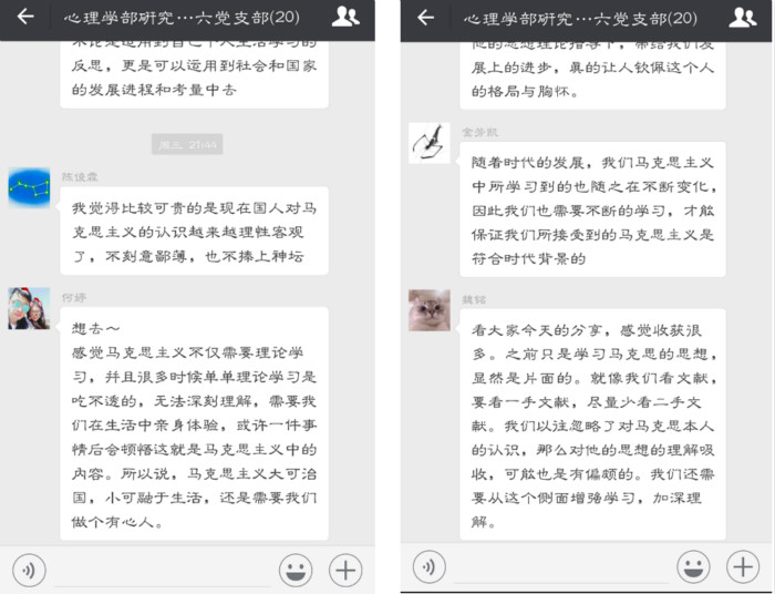 2018年5月9日晚,研究生第六党支部进行了5月的固定党日分享活动。共两名党员结合最近的时事新闻分享了污污漫画相关的文章和心得,其他党员也积极参与,讨论发表了自己的看法。 由于今年正值马克思诞辰200周年,所以首先马洁同志分享了几篇有关马克思本人以及马克思主义介绍的文章,她谈到:就像徐川老师讲的那样,马克思对于大多数人来讲,可能都是“最熟悉的陌生人”,我们比较熟悉的可能是挂在教室、过道里的“大胡子”的形象。实际上,马克思还有很多其他的面孔:家境优渥的富家子;才华横溢的大赢家;一贫如洗、儿女早夭的落魄人。对马克思主义的理解和利用,也不应局限于古板的教条和盲目地照搬。实际上,对马克思主义的利用,应该是以历史条件为转移的。在我国迅速发展的各个时期,我党都坚持了对马克思主义基本原理与我国实际国情的结合。习近平新时代中国特色社会主义思想的提出,就是顺应时代的发展,回答了“新时代坚持和发展什么样的中国特色社会主义、怎样坚持和发展中国特色社会主义”的问题。 李昌锦同志据此也认为我们的文化根基有一部分来自几千年传承下来的中华文化,也有一部分来自推动近现代中国发展的马克思主义。我们必须从这两个方面均汲取营养,才能在人类发展的历史上留下自己独特的发展轨迹。刘怡君也结合自身考研经验,谈到,当初考研的时候需要背马哲,乍看确实比较生涩,也是政治里面最难啃的内容,但是当试着去进行一些理解和类推的时候——就比如辩证唯物主义观,告诉我们应当从各个角度,客观的去看待周遭的事物;又比如矛盾的主要方面和次要方面,告诉我们解决问题的时候不要病急乱投医,要从重点着手……诸如此类还有很多。她认为这是马克思主义超越其他神学宗教的闪光之处;马克思科学观其实渗透在我们生活的方方面面,她很赞成将其设置为公共必修课,因为马克思主义告诉我们如何去看待周遭的事物,如何行动;从上层来讲,作为治国之道,马克思主义有其必要性与唯一性。而我们青年人真的应该多学马克思。 然后,赵宸同志分享了两篇文章,一篇是习总书记曾在不同场合分享过的10个个人成长故事。另一篇是对他近几年青年寄语的整理。她谈到,之前读《习近平的七年知青岁月》的时候,就感觉到习总书记青年时期的经历是很有青年榜样引导作用的。他在陕西梁家河插队时一方面保持着“内在有激情,外在从容不迫”的工作状态,另一方面也同时保持着充分利用闲余时间阅读和学习的习惯。当然,她认为青年榜样也存在于各行各业中,像今年的中国青年五四奖章颁奖对象就包含了军人、警察、政府工作人员、科研人员、教师、学生等不同行业的人员。对于青年人来说,有理想信念,有正确的世界观、人生观、价值观是很重要的,同时,自身不断地学习、奋斗、创新也是很重要的,这些也是总书记给青年寄语时常常会提到的主题。 杨颖同志据此谈到自己上周末有幸参观了习总书记青年时期工作的地方——河北正定,感叹于习总书记青年时期为人们着想为人们服务的精神,大胆创新大胆实践,习总书记在正定时期的很多政策和实践都能对应到十九大的很多方面,让她真真切切的体会到实践的理论,感受到我们一直学习的很多精神和理论都是来源于基层经验。而李昌锦同志则谈到,我们现在很多大学生不缺知识,不缺经历,缺的是社会责任感。少年强则国强不是指精致的利己主义者,而是真正关心国家民族兴衰的青年,未来的社会是我们的,如果我们不为这个社会做些什么,就没人会做了! 通过这次分享活动,支部同学们对马克思主义和作为青年的责任有了更深刻的认识,也纷纷表示,“少年强则国强”,积极承担一名大学生的责任,要从深入学习理论开始,更要从实践开始! 供稿:刘苗苗 供图:刘苗苗 |