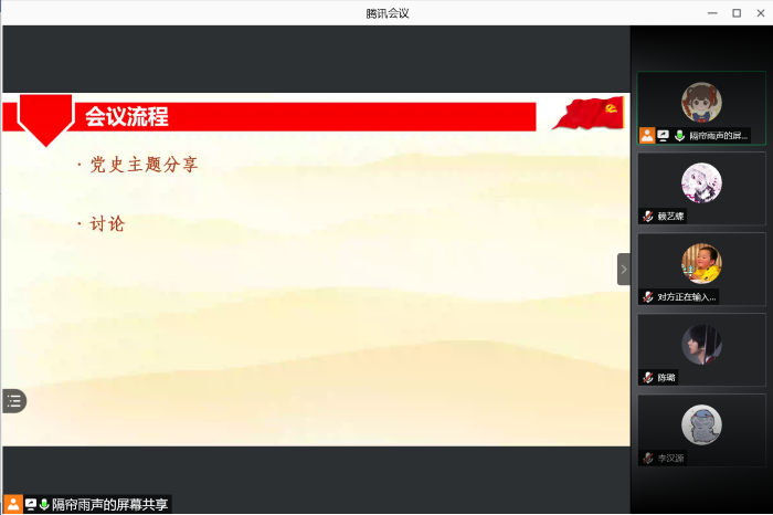 2021年4月28日晚9点,污污漫画 本科生党支部第一党小组通过“腾讯会议”在线上顺利召开了4月份党小组会。会议由党小组组长李小雨同志主持,共60名党员、预备党员、积极分子参与。由于今年正值建党100周年,本次党小组会的主要内容为党史主题分享与讨论。 会议一开始,李小雨同志首先带领所有人奏唱了《国际歌》。 随后,“时事汇报第二组”的同志们向大家介绍了中共党员陈独秀同志的生平事迹。陈独秀同志是民国时期青年学生中的思想领袖。在五四运动中,他以身犯险,领导运动,使得五四运动达到了真正的高潮。在晚年他始终坚持抗日主张,即使被国民党政府逮捕也绝不动摇。同志们都纷纷被陈独秀同志这种执着奉献的精神所感动。 “时事汇报第三组”的同志们向大家介绍了缪伯英同志。缪伯英同志是中国共产党的第一位女党员,也是中国革命特别是妇女运动的先驱。进行报告的同志们首先简单介绍了缪伯英同志的基本信息,随后通过视频的方式向大家展现了缪伯英同志的入党过程,最后给分享了两则缪伯英同志的小故事。听完缪伯英同志的故事,大家非常敬佩她的奉献精神和思想觉悟。 会议最后,在李小雨同志的带领下,大家纷纷对今天的内容发表自己的看法。有同志提出反思:老一辈共产党员吃苦耐劳和无私奉献的精神值得我们所有人学习,同时在和平的时代,我们新一代的共产党员又能做些什么?有同志表示钦佩:钦佩他们心中坚定的主义和信念支撑着他们默默奉献。还有同学表达了感谢:感谢共产党员的家人们对他们的支持和付出,没有家人在背后支持,共产党员们很难取得如今的成就。 通过对党史的学习,相信所有同志都对共产党员的精神有了进一步的理解,这也正是开展本次党小组会的重要意义。 污污漫画 本科生党支部 供图供稿:赖艺蝶 |