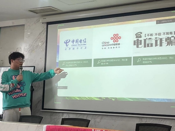 其次,班长姜翰臣就电信诈骗向同学们进行宣讲,普及同学们电信诈骗的知识,提高同学们的防范意识。