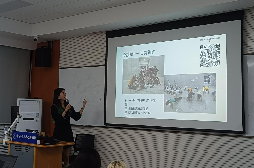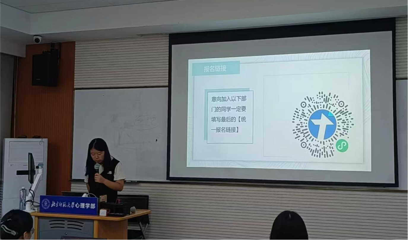 接下来,主持人宣布招新大会正式开始,各学生团体代表按顺序依次上台宣讲。上半场宣讲由团委和学生会的职能部门,以及职业发展协会进行,下半场是学生活动团体的宣讲环节,包含一系列学部社团与赛客体育联盟的各球队。每位宣讲人限时3-4分钟,并展示报名二维码。