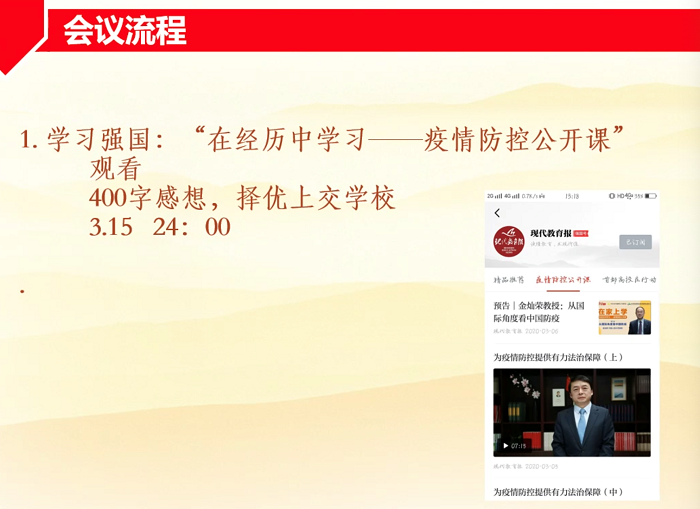 2020年3月7日晚上18:30,污污漫画 本科生党支部于“腾讯会议”平台召开了组织生活会。这是春季学期第一次组织生活会,也是污污漫画 本科生党支部第一次“云”会议。本次组织生活会由支部书记苏茹昕主持。首先同志们起立齐唱国际歌。 “在这一特别而又特殊的时期,大家过得还好吗?”一声暖心的问候,开启了本次会议的主题——疫情期间党支部的工作及成员们的抗疫经历分享。 首先,苏茹昕书记下发了几点通知。第一是号召大家在学习强国平台观看疫情防控公开课,写下自己的感想积极投稿;其次,党员需要学习学生骨干学习材料,并在学习之后自己出一道考题、写一份感想或笔记,以加深理解。另外,符合条件并且有意愿继续入党的积极分子需着手开始准备发展大会的材料。最后,微党课大赛即将召开,在疫情期间有所思考感悟的成员都可以参与。 接下来,由周楚皓同志主持抗疫事迹分享环节。 陈楚怡同志分享了自己由一次偶然忘记带门卡而开启的志愿工作。她当时出于无奈旁观小区门口的社区工作人员实施检查工作,没想到这引发她进行了自我反思——我能否在这次抗疫中做更多贡献,而不只是宅在家里呢?于是,她通过父亲的工作渠道主动联系寻找需要心理援助的地方,然后通过京师心理大学堂等平台以及咨询师兄师姐,搜集心理建设的知识,撰写成文稿给公众号等媒体使用。陈楚怡同志认为这是一个很好的传递精神力量想机会,也是心理学人成长的机会。分享结束后,她还号召其他成员参与后续的情绪调控线下讲座活动。 下一位是苏茹昕同志进行分享。她浏览泉州市公众号招募志愿者的信息并报了名,被成功录用为志愿者,并参与了一系列支持工作。她还代表所有参与过线上抗疫的同学分享了工作过程。线上抗疫的第一部分是线上咨询,通过建立微信群,给面临挑战的人们提供陪伴和情感支持。接到的来访者有宅家的大学生、担心自己患病的人、寻求育儿经验的家长、想要控制自己成瘾行为的人等方方面面。很多问题她不知道该怎么回答,有时也不知道自己的回应是否帮到了对方,但她实事求是,明白自己能力的范围,在一开始就向对方坦诚自己大学生的身份,并尽力做到用心倾听。她学习到的经验是,无需过于在意自己志愿工作的不完美,有行动是最重要的。 线上抗疫的第二部分是科普文撰写。于心怡同学独立写了一篇科普,也审了其他同学为疫情写的文章,她感觉这些工作让她在无聊里找到了一个着力点,可以运用专业相关的知识技能为抗疫心理防线建设提供一点点支持。在写文章的过程中,她既学到了新的知识,也缓解了被“困”在家的无力感和焦虑感。 线上抗疫的第三部分是开心说吧工作,心理辅导员们鼓励师大附小的小朋友们行动起来,为抗疫一线的奋斗者们送去鼓励,表达自己的感谢。孩子们的图画、刺绣、积木等作品让大家深受感染。 接下来是线下抗疫分享环节。蒋祎诺同学参与了社区卡口来往人员登记和社区内巡逻工作。整体上,人们都很配合工作,不过一次劝说不愿登记的居民的工作让她印象深刻。她从社区工作者那里学到,基层工作重要的是耐心和共情,基层工作者非常辛苦,值得我们学习。魏铱楠同学向社区书记毛遂自荐,参与到了每晚社区卡口执勤工作,最初的几天恰逢大雪,手脚都冻的冰凉。她感到社区工作非常紧张,来往人员和车辆非常频繁,每天登陆的车牌号能达到150。在执勤期间,她认识了一位从大年初二开始就坚持在防疫第一线的叔叔,还见到了一位在风雪中等待住户取餐等了20分钟的外卖小哥,她深感钦佩。她还分享了自己对于是否通融不守规则的居民的思考,提出对如何让工作严谨而不死板的反思。 最后开启讨论环节。周楚皓同志分享了自己如何帮助志愿者协调与不配合工作的群众的矛盾。陆靖仪同学分享了自己在武汉的真实经历。梁静同学分享了自己见证的社区工作——挨家挨户上门调查居民春节前出行情况,为需要关注的居民提供寻求支持的信息。苏茹昕同志讲述了自己在公交车劝导工作中见到的一位给中央写信的老爷爷,感悟到建立向国家建言献策意识的必要性。周靖怡同学分享了自己对于本次疫情中对国家科技进步、行政工作效率提高的观察。 周楚皓同志在最后号召大家继续撰写抗疫期间的心得并向支部投稿。本次生活会顺利结束! (本科生党支部 祁新越 供稿供图) |