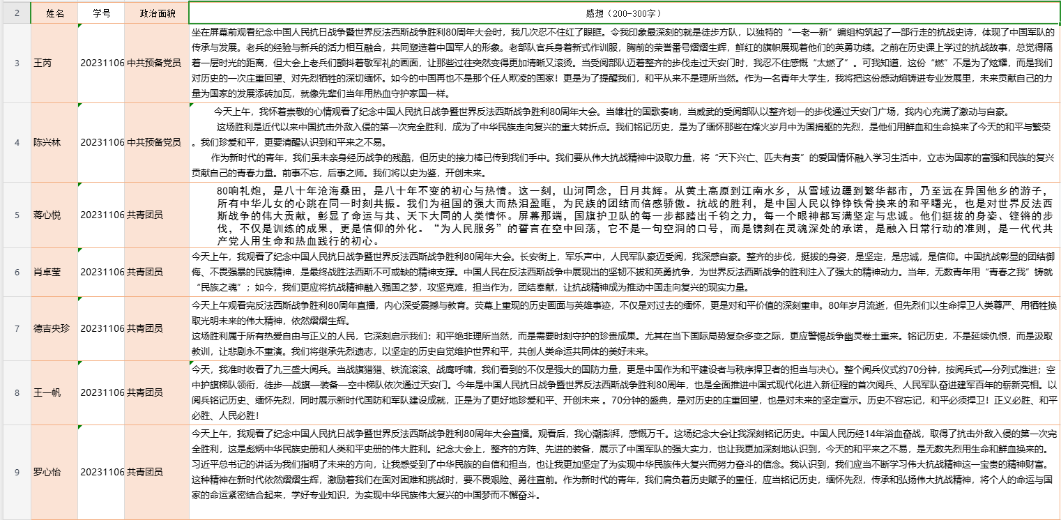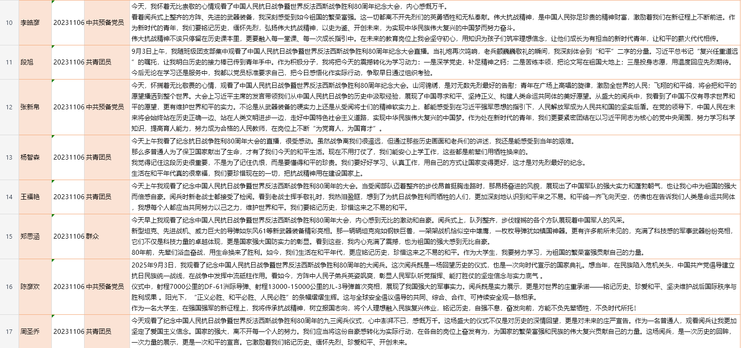 观看过后,团支书动员与会同志撰写观后感,各位与会同志积极参与,提交了许多具有价值的观后感。团员同志们从庆祝大会中获得鼓舞,表达了对祖国繁盛的自豪,对中国人民抗日战争牺牲的先烈的敬畏,对和平的珍视;未来将会把这份自豪转化成为学习专业知识、育人能力的动力,为建设社会主义现代化强国贡献自己的力量。