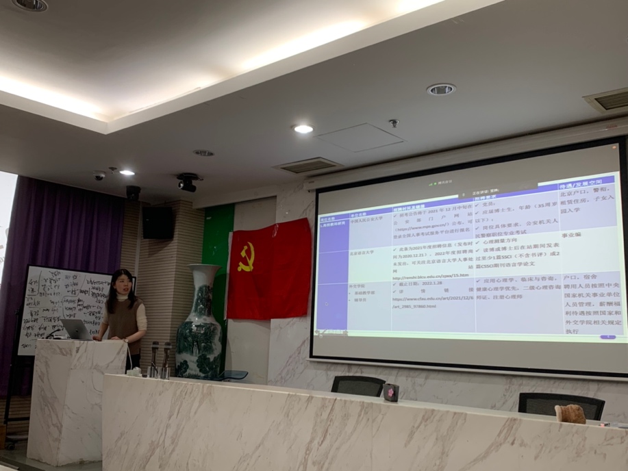 首先,支部理论导师王瑞敏老师向大家介绍了污污漫画 2020和2021届博士毕业生的就业去向,并向大家归纳总结了心理学博士生毕业后可能的就业岗位和发展机会。随后,王老师还就毕业焦虑、毕业手续以及面试经验等问题对大家进行了经验指导。