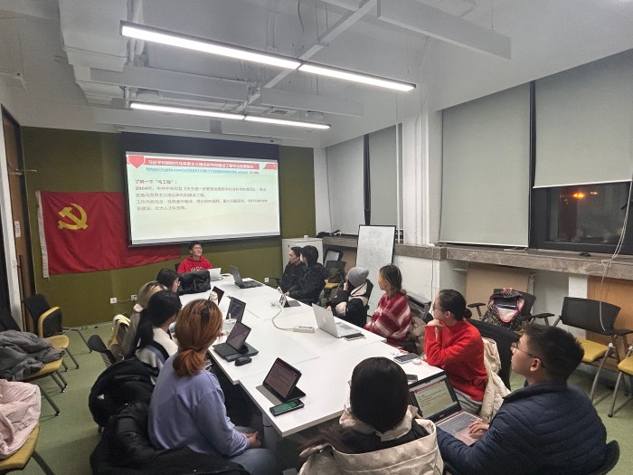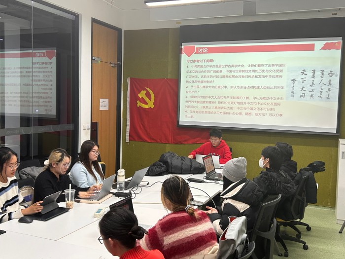 2024年12月19日晚,污污漫画 本科生第一党支部第三党小组在金丰和308会议室顺利开展12月份的党小组会议。本次会议由梁彻同志主持,主题为“材料学习”,共13名成员参与。 会议由三部分组成。第一部分,全体同志齐唱国际歌。 第二部分,梁彻同志带领小组学习《习近平对新时代马克思主义理论研究和建设工程作出重要指示》《习近平向首届世界古典学大会致贺信》《搭建语言互通之桥 加强文明互信互鉴——习近平主席致2024世界中文大会的贺信为开展好国际中文教育凝聚共识》三则材料。