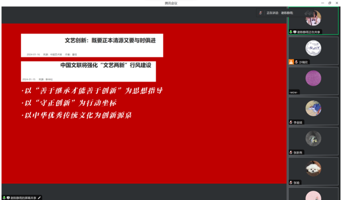 谢陈静雨同志就“春晚中如何做出大家喜爱的文艺作品”这一主题进行了分享,认为只有保持初心、关注到观众真正的需求、将文化自信等理论与实践相结合,才能让春晚更加精彩。