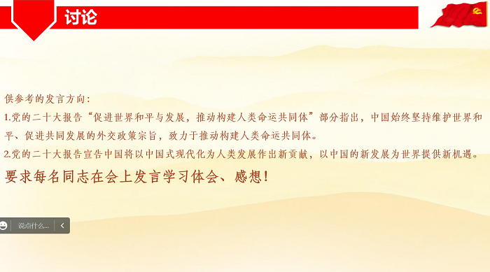 首先,全体起立,奏唱《国际歌》。随后,第二党支部第四小组组长程先楷同志带领同志们观看近期我国外交的有关新闻报道,同志们一起在腾讯会议中进行学习。