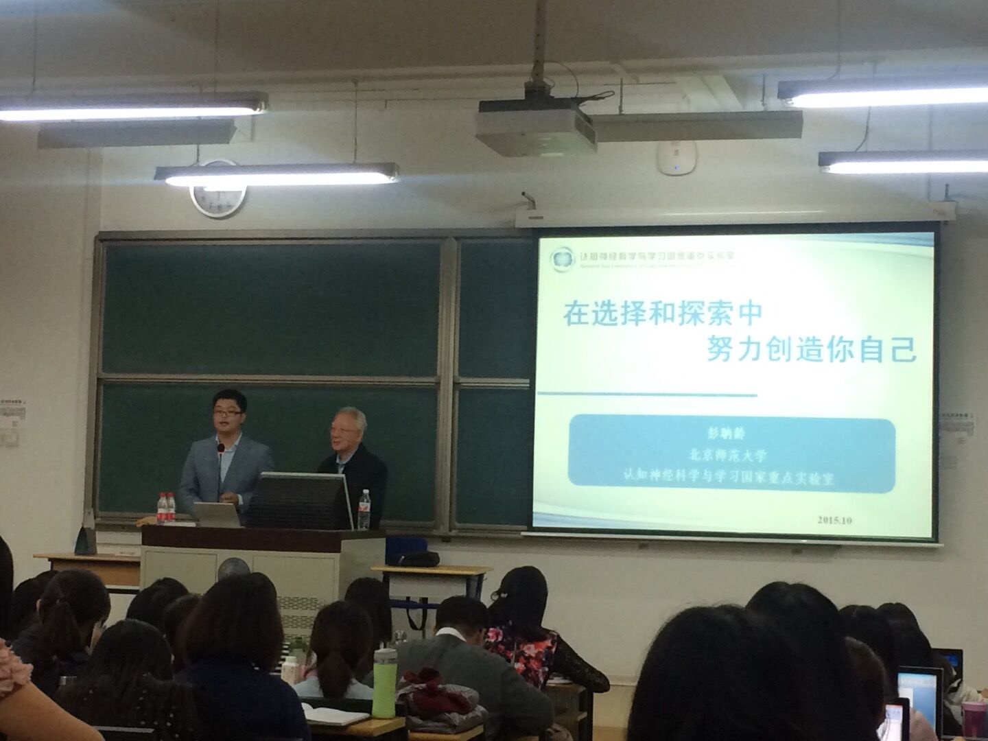 2015年10月16日晚上18:00在北师大教八101教室,北师大心理学院著名教授彭聃龄老师为2015级MAP学子们的讲座如期开始。此次讲座的主题为“在选择和探索中创造自己的人生”。本次讲座由MAP项目组筹委会成员、MAP一班班长周群力同学主持,他主持风格幽默风趣。当主持人尊称彭聃龄教授为彭爷爷时,彭爷爷脸上慈祥的笑容显得格外亲切。彭教授的人格魅力引来了同学们阵阵掌声,万众期待的讲座也就这样开始了。