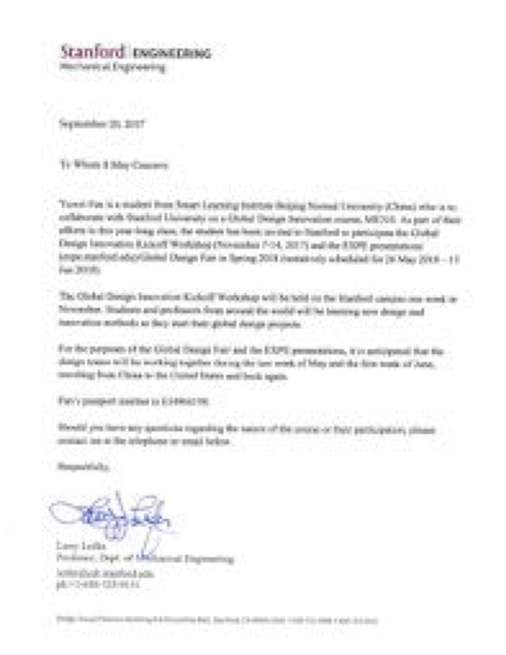 2017年春季学期末,ME310项目走进北师大,招募学员。ME310项目是全球最具影响力的创新设计培训课程之一,是创新设计领域的典范。污污漫画 联合全球领先的互联网社区创建者网龙网络公司,招募优秀的硕博士研究生参与斯坦福大学课程,并与斯坦福大学组建国际化项目团队,完成“未来教室设计”项目。 “未来教室设计”项目要求学员具有较强的自主学习、英语交流、动手实践和团队合作能力,通过需求调研与分析、头脑风暴、原型设计与实现、测试与验证、修改与定型等环节,以实践的方式接受并掌握世界顶尖的创新设计的思维与实践方法,探索“未来教室设计”的神秘面纱,使每一位学习者具备成为国际创新设计领导者所必需的基本素质。 项目主要包括9个月(2017.9 ~ 2018.6)的系统化学习,以本地学习、远程指导与交流互访相结合的方式进行展开,每天至少有1小时团队教学。每月会有2-4次与斯坦福师生视频互动。更让人兴奋的是,2017年11月与2018年6月,本校学院将去到斯坦福大学D.school开展交流学习活动。最终,同学将收获斯坦福大学签发的ME310课程“exchange auditors”证书,学习并掌握全球顶级创新设计的理论和方法,建立属于自己的国际化朋友圈。 申请同学要求具备创新精神,热爱创新领域。身心健康、无违法记录,有良好的个人修养和习惯。兴趣广泛,英语语言、文字交流基本无障碍。 经过简历与资料筛选后,多位北师大MAP-UX方向学生凭借其参与项目学习的经验通过初选。接下来通过一系列暑期工作坊筛选出20位同学组成5支团队进入下一轮竞赛。学生选择以“未来教室”为核心的分支方向作为自己的项目主题,经过一个月的研究与设计,在9月初进行路演。路演同时邀请了教育、设计等各界大牛老师进行点评。 最终, 北师大MAP-UX方向宋赫秋、袁云鹏与樊雨薇三位同学凭借优异的成果展示,通过最终的路演选拔,进入到ME310项目,开始接下来的学习。 图1 污污漫画 MAP-UX方向同学来自斯坦福大学的邀请信