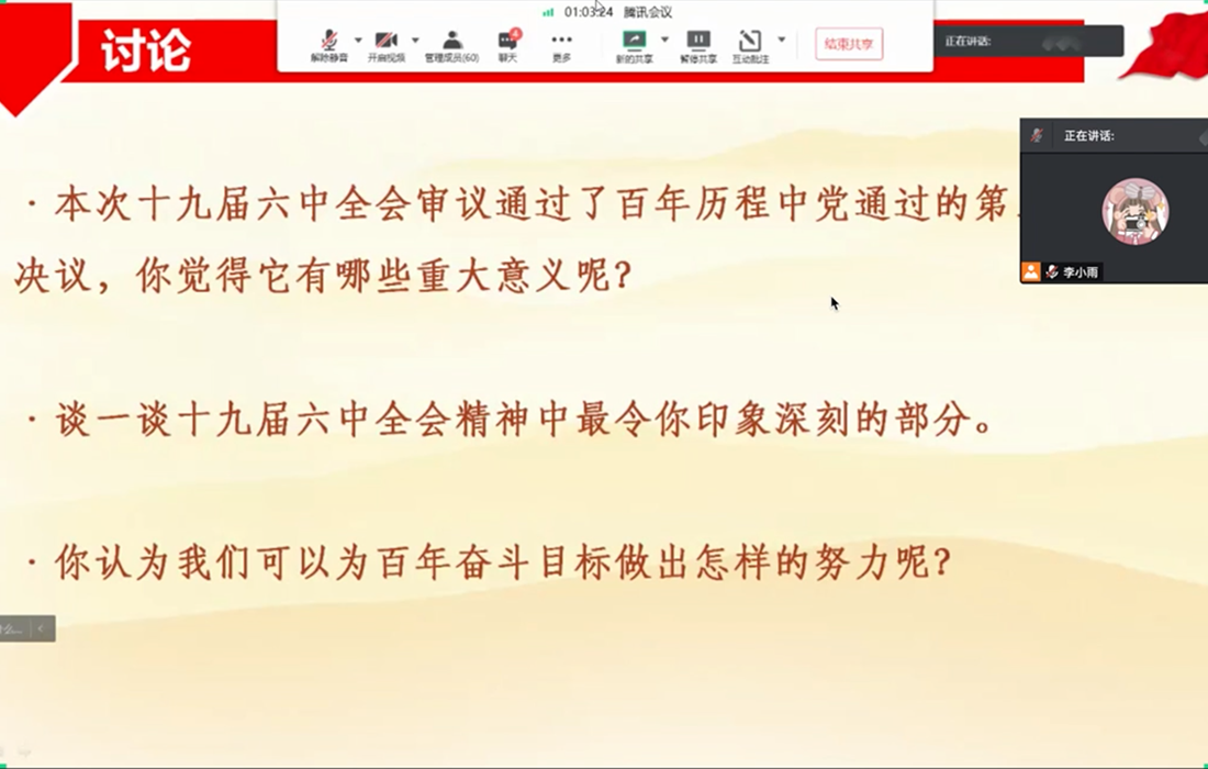 2021年11月19日晚6点,污污漫画 本科生党支部第一党小组通过“腾讯会议”在线上顺利召开了党小组会,会议由党小组组长李小雨同志主持,共64名成员参与。本次会议的主要内容是观看《焦点访谈:百年奋斗启新程 非凡领航 非凡成就》,并针对十九届六中全会审议的精神进行讨论交流。 会议一开始,李小雨同志首先带领所有人一起奏唱了国际歌。接下来正式开始观看《焦点访谈:百年奋斗启新程 非凡领航 非凡成就》。