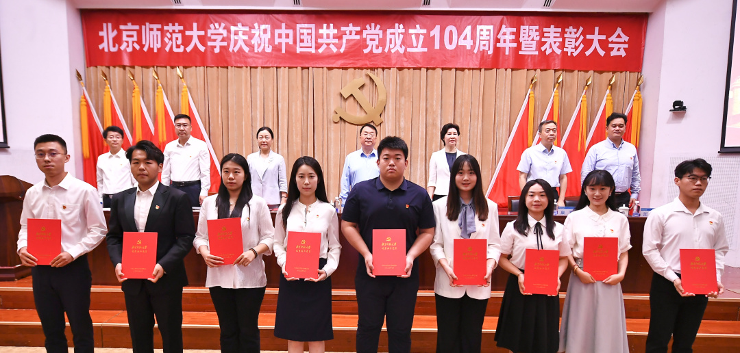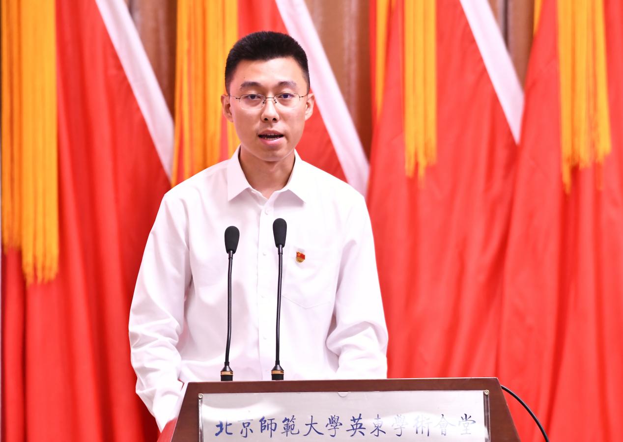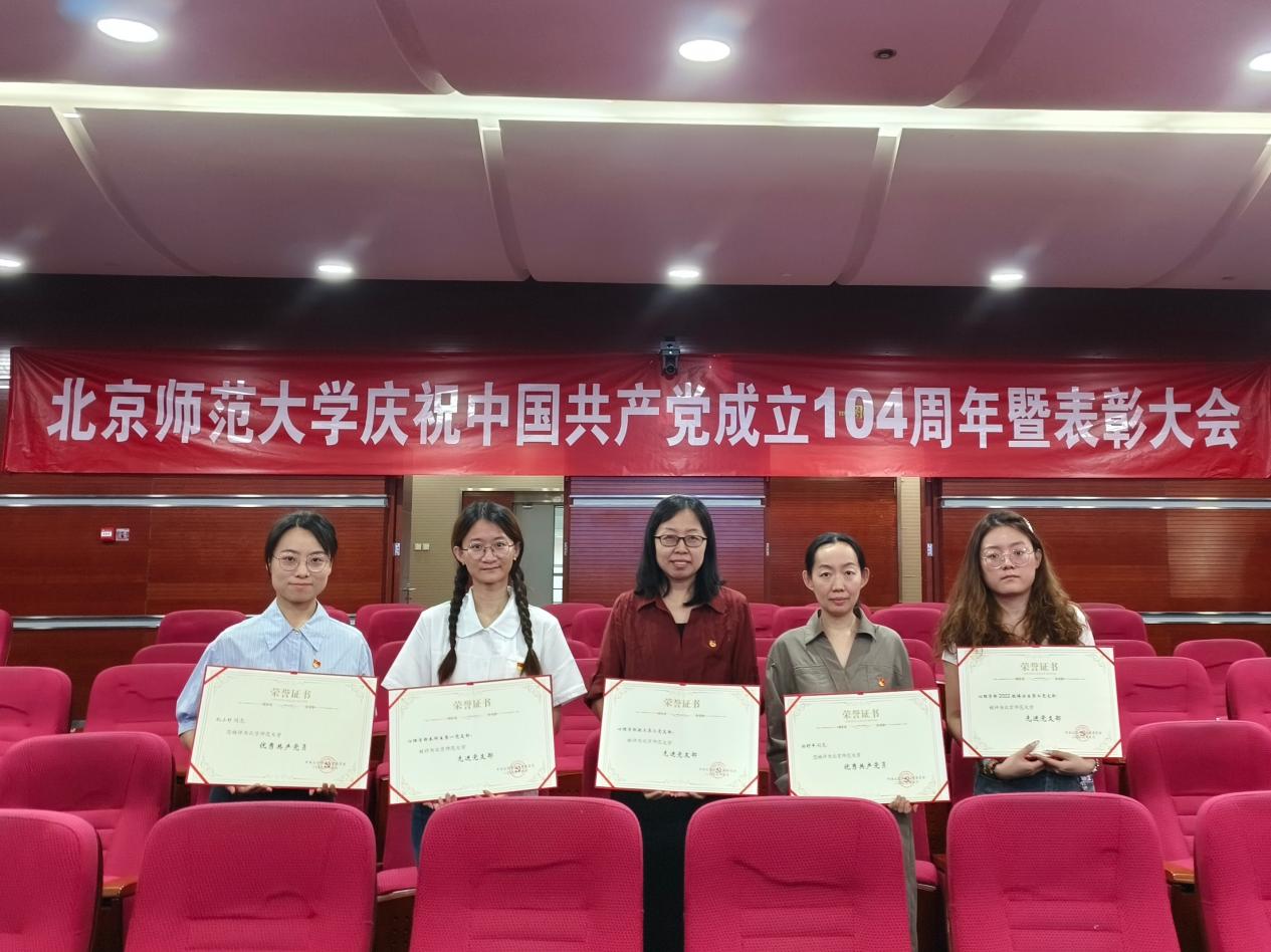优秀党务工作者闫琰(左五)上台领奖 此外,2024级学术硕士程先楷作为学生获奖代表发言,分别从“在党组织培养中树立志向”“在个人实践中检验本领”“在支部工作中勇担重任”三方面,系统地分享了自身作为一名共产党员的探索历程与感悟。他用自身的实践与思考,在“成为一名什么样的学生党员”的问题中交出了一份属于心理学人的精彩答卷。