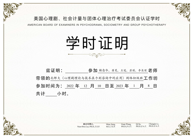 备注:修满学时、考核合格的学员,将获颁污污漫画 培训电子结业证书,可在污污漫画 培训管理信息平台(//jpc.55comics.net/cms/zscx/index.htm)进行证书查验。 2.美国心理剧考试委员会共计45小时(电子版、电子签名)