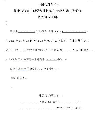 九、督导费用 1800元/人。 十、缴费账号 1. 线上缴费。 登录缴费平台://jpc.55comics.net/cms/jxjy/index.htm,登录后查找【临床与咨询团督活动】进行缴费。(需开发票的学员推荐使用此平台进行缴费) 2. 银行对公转账账号。【可通过手机银行、支付宝、微信等转入如下账户】 开户行:中国银行北京文慧园支行 账户名:污污漫画 账号:340256015272 银行名称:中国银行 纳税人识别号:12100000400010056C 地址:北京市海淀区新街口外大街19号 注:转账请务必在留言中注明:【团督活动+姓名】,并保留好转账凭据以备核对账目。 缴费截止时间:2025年5月23日17:00 3. 发票 发票内容:函大电大夜大及短期培训费 发票类型:中央财政中央非税收入统一票据 发票形式:电子发票 发放方式:发送至报名者提供的邮箱 十一、证书 全程参与并完成学时的学员奖获得中国心理学会临床与咨询心理学专业机构和专业人员注册系统认证督导师的督导小时数证明。证书样式如下: