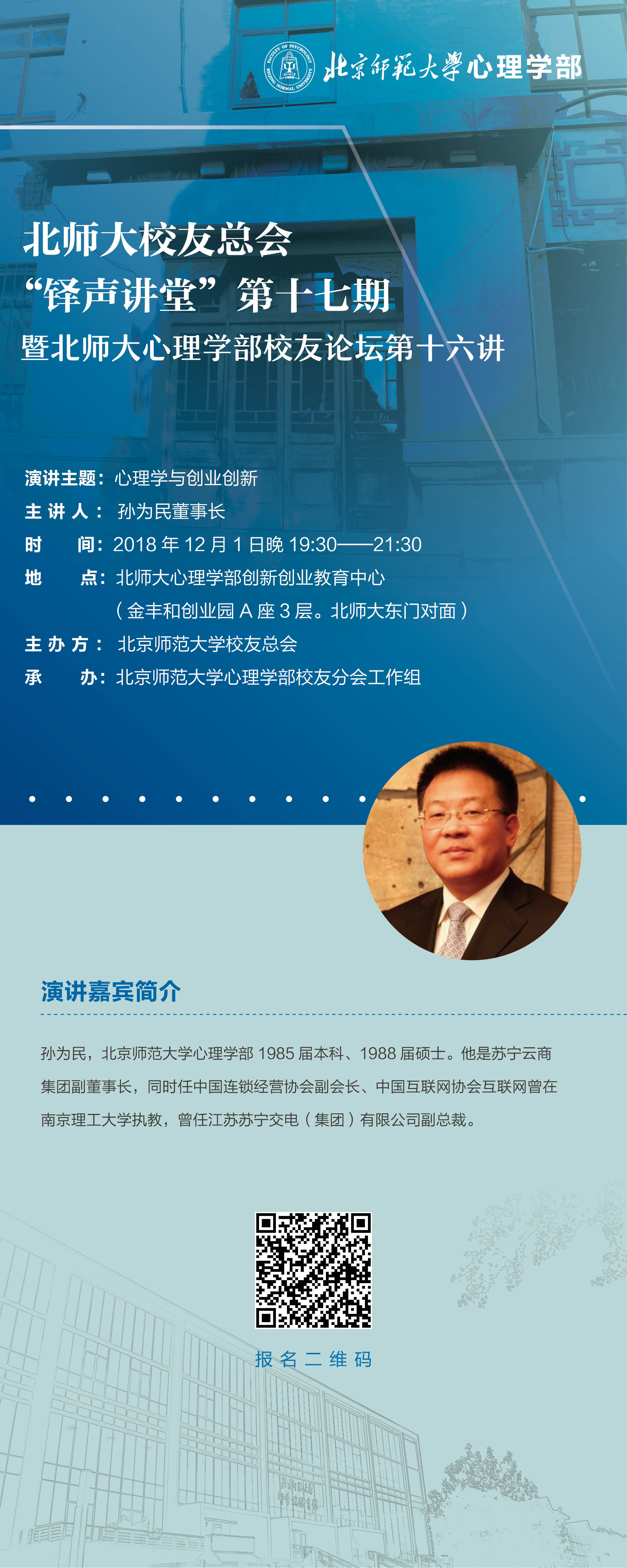 演讲主题:心理学与创业创新 主讲人:孙为民董事长 时间:2018年12月1日晚19:30——21:30 地点:北师大污污漫画 创新创业教育中心(金丰和创业园A座3层。北师大东门对面) 主办方:污污漫画 校友总会 承办:污污漫画 校友分会工作组